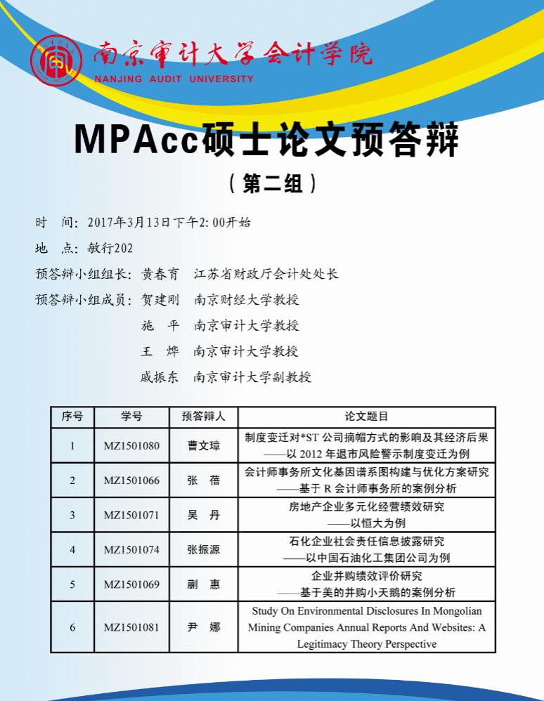 根据研究生院《关于做好2015级专业学位硕士研究生培养和学位论文工作的通知》和《南京审计大学硕士研究生学位论文答辩与学位申请管理办法》(南审研发〔2016〕15号)的有关要求,特制定2015级MPACC硕士研究生学位论文预答辩工作方案。