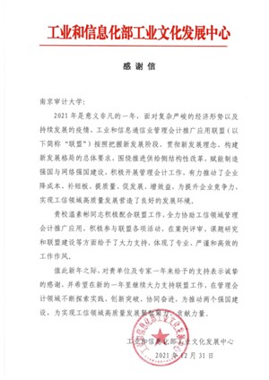 工信部工业文化发展中心向南京审计大学发来感谢信,对智能管理会计与内部控制研究院院长温素彬教授提出表扬,诚挚感谢在工业和信息通信业管理会计推广应用方面给予的大力支持,希望继续加强合作,共同为推动制造业高质量发展作出新的贡献。