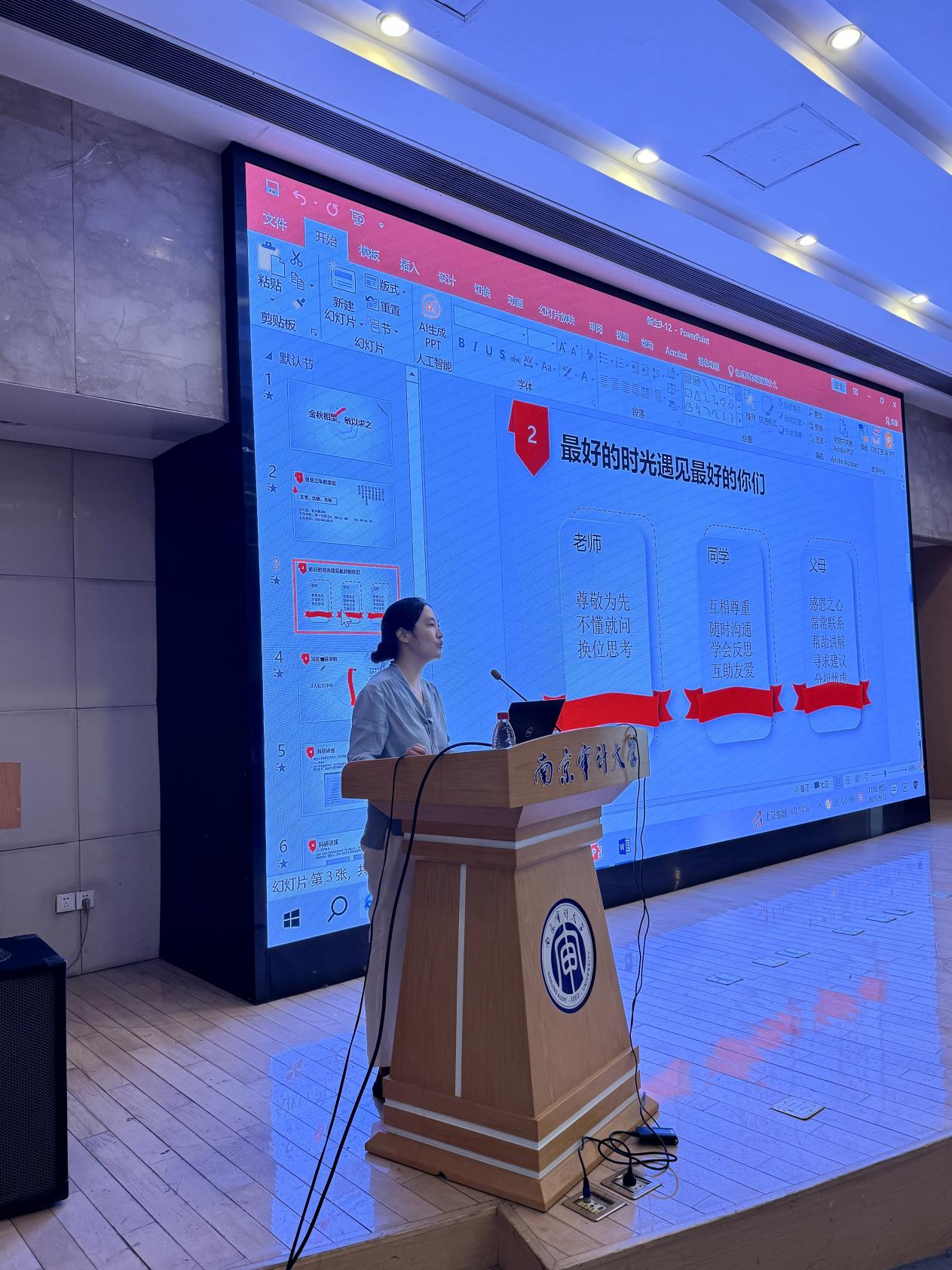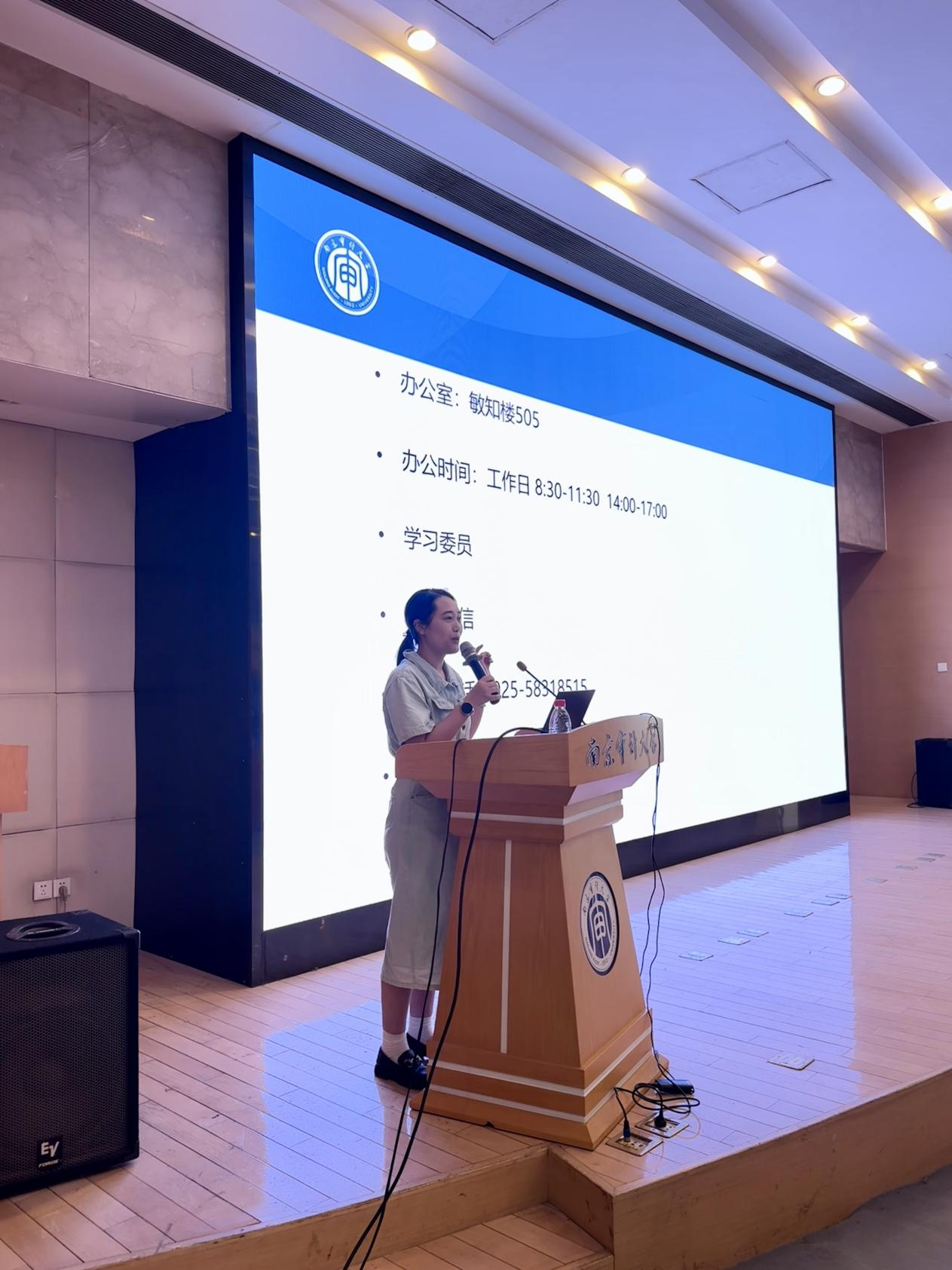 肖艳对研究生日常事务管理、奖助管理规定以及党团和班级建设等方面进行了讲解,介绍了研究生管理服务体系,告诉同学们遇到问题时如何寻求帮助。同时,肖艳还强调了思想理论教育和价值引领的重要性,对党团和班级建设、学生组织的构成、党员发展事项等进行了说明,并对评奖评优、外出请假、职业生涯规划与就业指导等日常事项进行了提醒,最后肖艳寄语同学们,希望大家在研究生阶段能够脚踏实地,精进学业,科学规划,勇敢追梦。