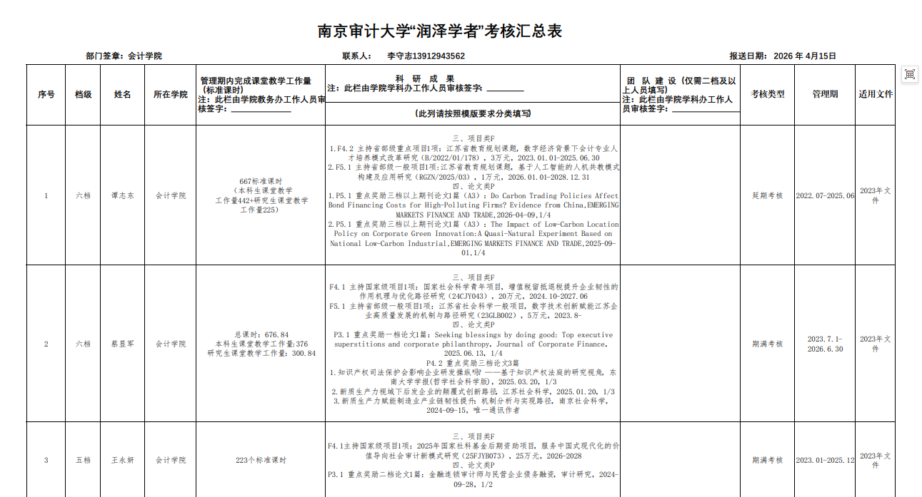 附件:南京审计大学“润泽学者”考核汇总表