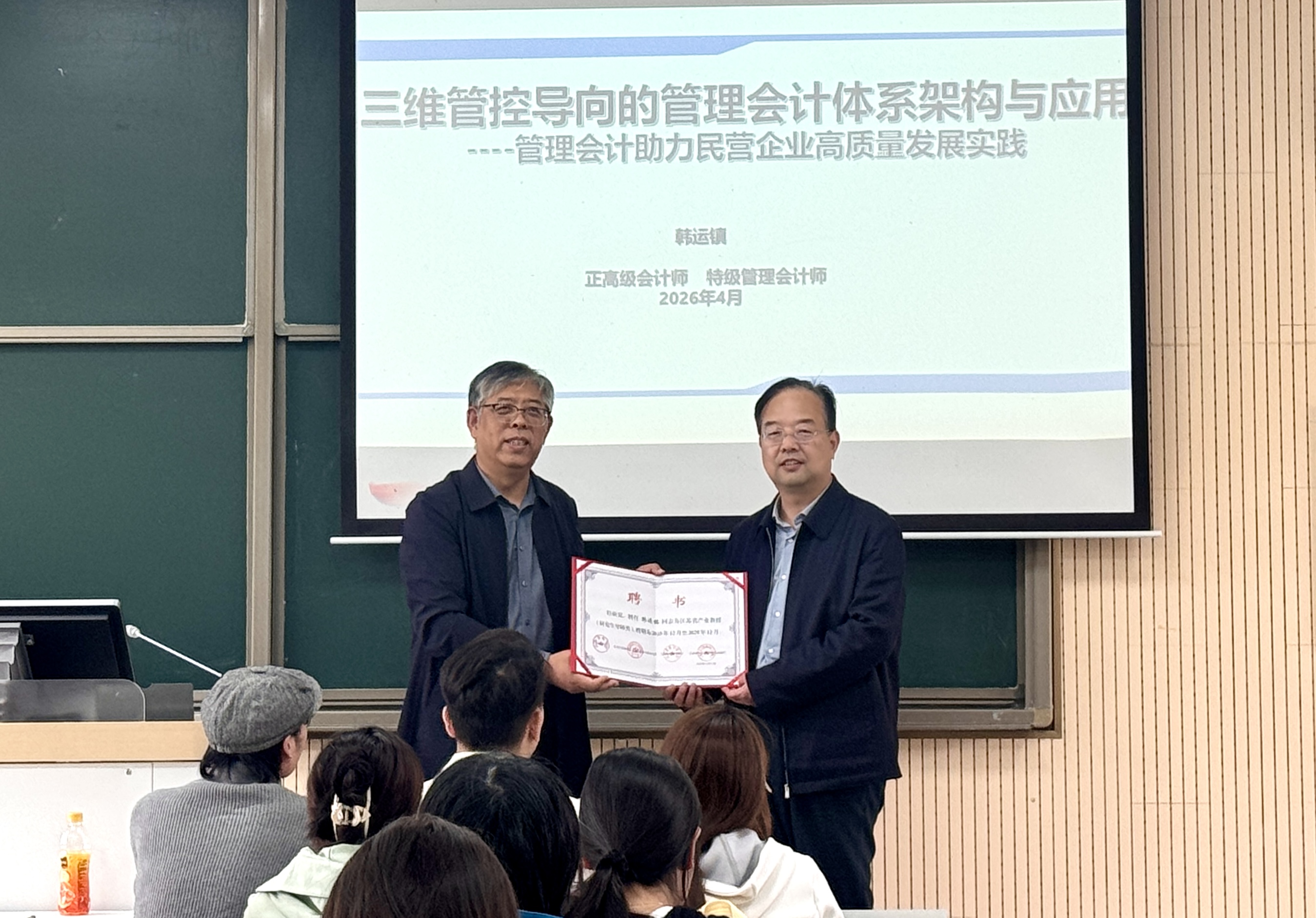 2026年415日,手机足彩投注网站 举办的34期润泽产教融合前沿讲坛”顺利开展。论坛有幸邀请到正高级会计师、特级管理会计师韩运镇作题为“三维管控导向的管理会计体系架构与应用--管理会计助力民营企业高质量发展实践”的专题讲座。讲座由足彩投注 院长温素彬主持,温素彬院长为韩运镇教授颁发了江苏省产业教授(研究生导师类)证书,足彩投注 研究生参加讲座。